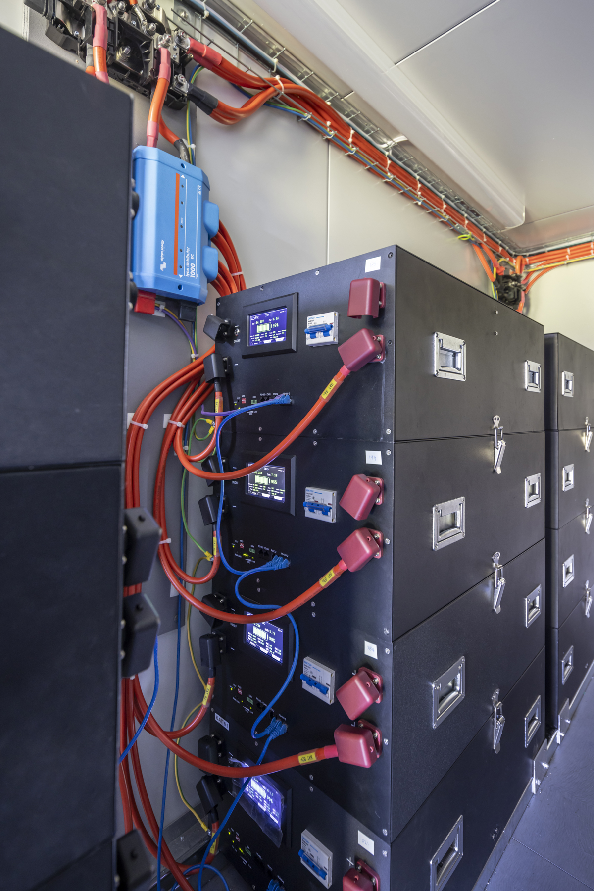 From the brief it was a requirement that ongoing operational costs should be minimized. In the Solomon Islands the electrical grid is going through a transition but current costs of electricity are still hight at ~1USD/kWh.  It pays to be able to store or export as much solar energy as possible. Thus at the heart of the PowerCrate is the large LiFePO4 Battery Energy Storage System (BESS)